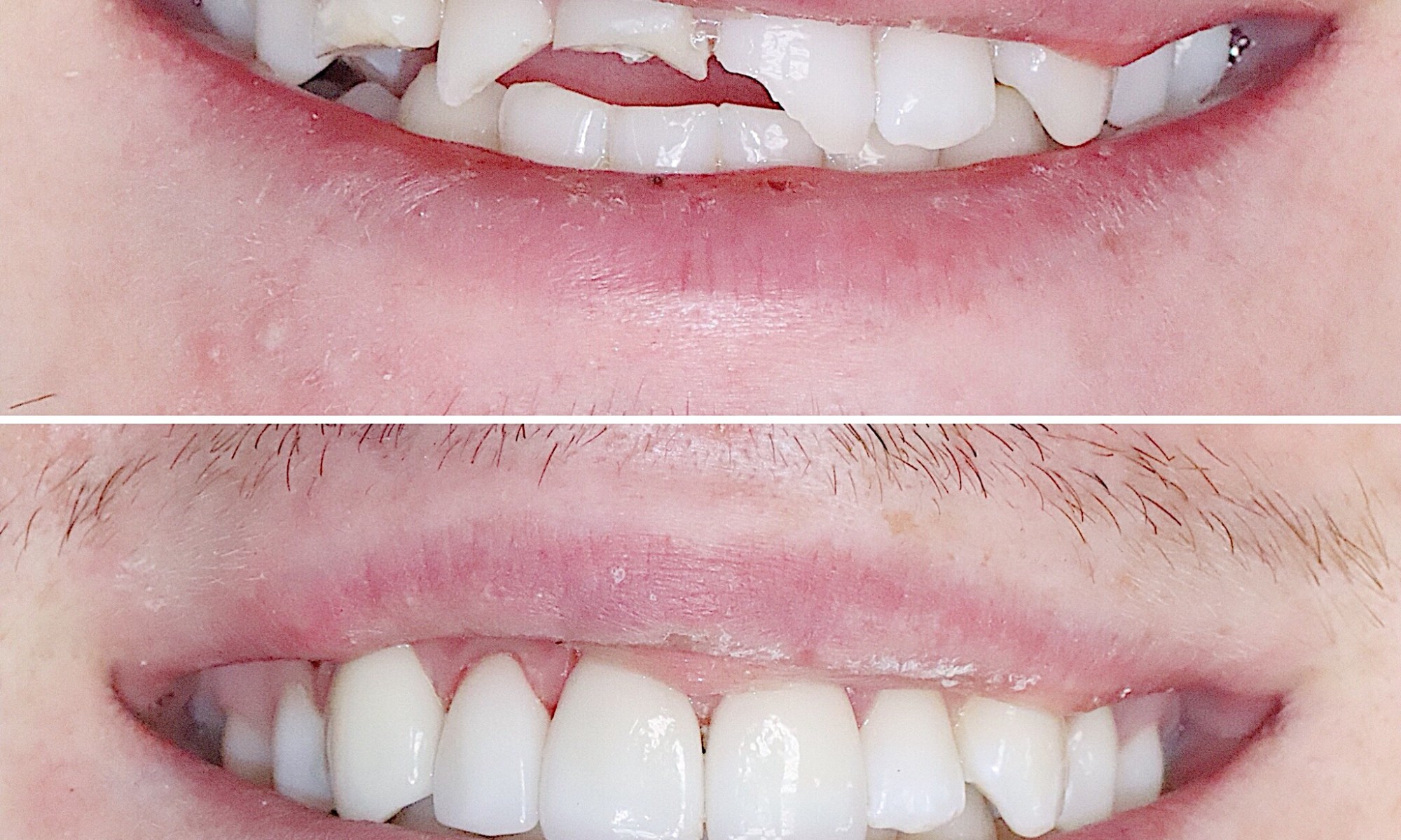 Young patient suffered a seizure, fell and broke four teeth. Root canal therapy and resin buildup on four teeth were completed so he could return to school. Crowns were completed at the second visit for better aesthetics and added protection.