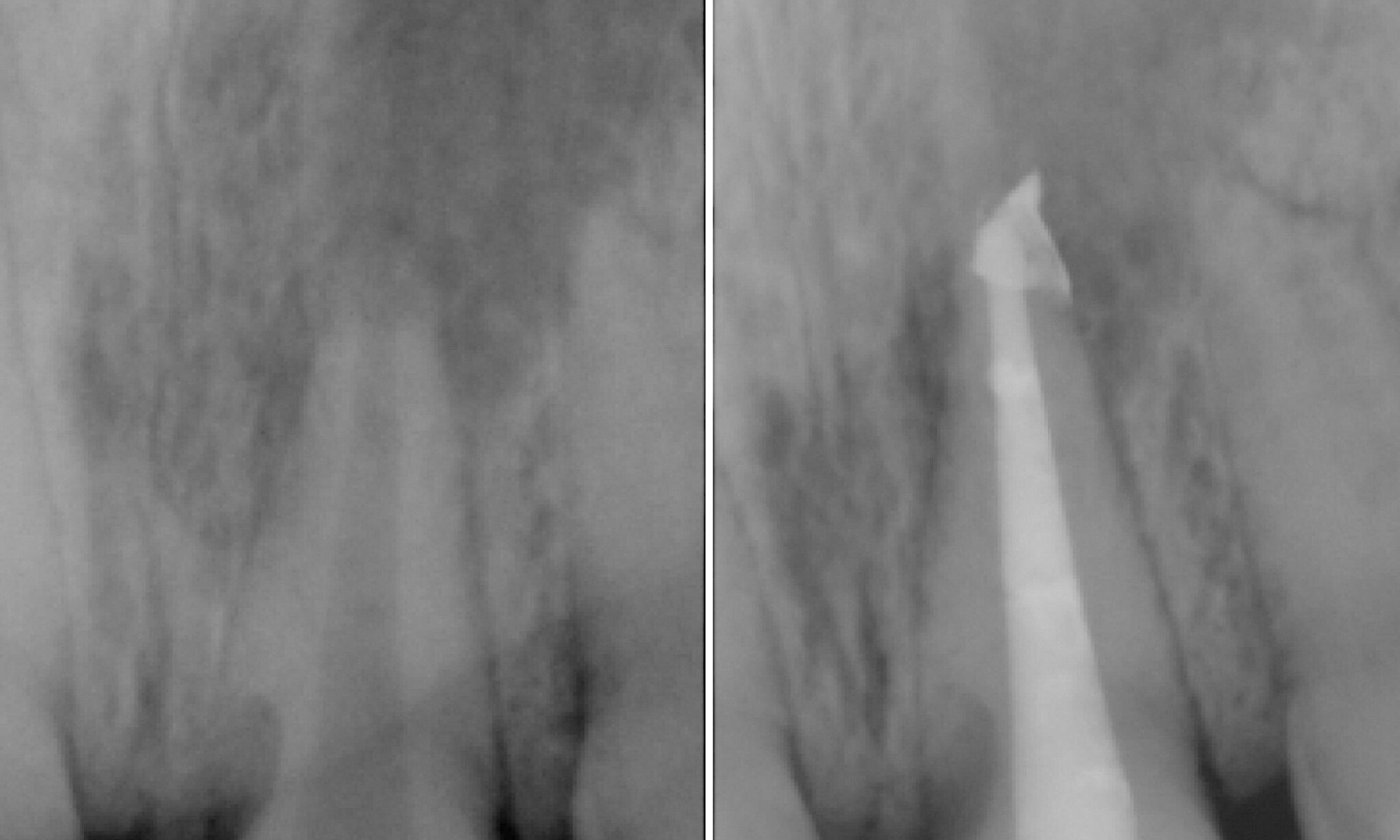 Trauma CAN cause infection. After suffering from an accidental hit to the face, this patient began to have pus draining through her gums. Root canal therapy was completed to remove the bacteria inside the tooth. It is important that the entire canal is cleaned out and sealed.