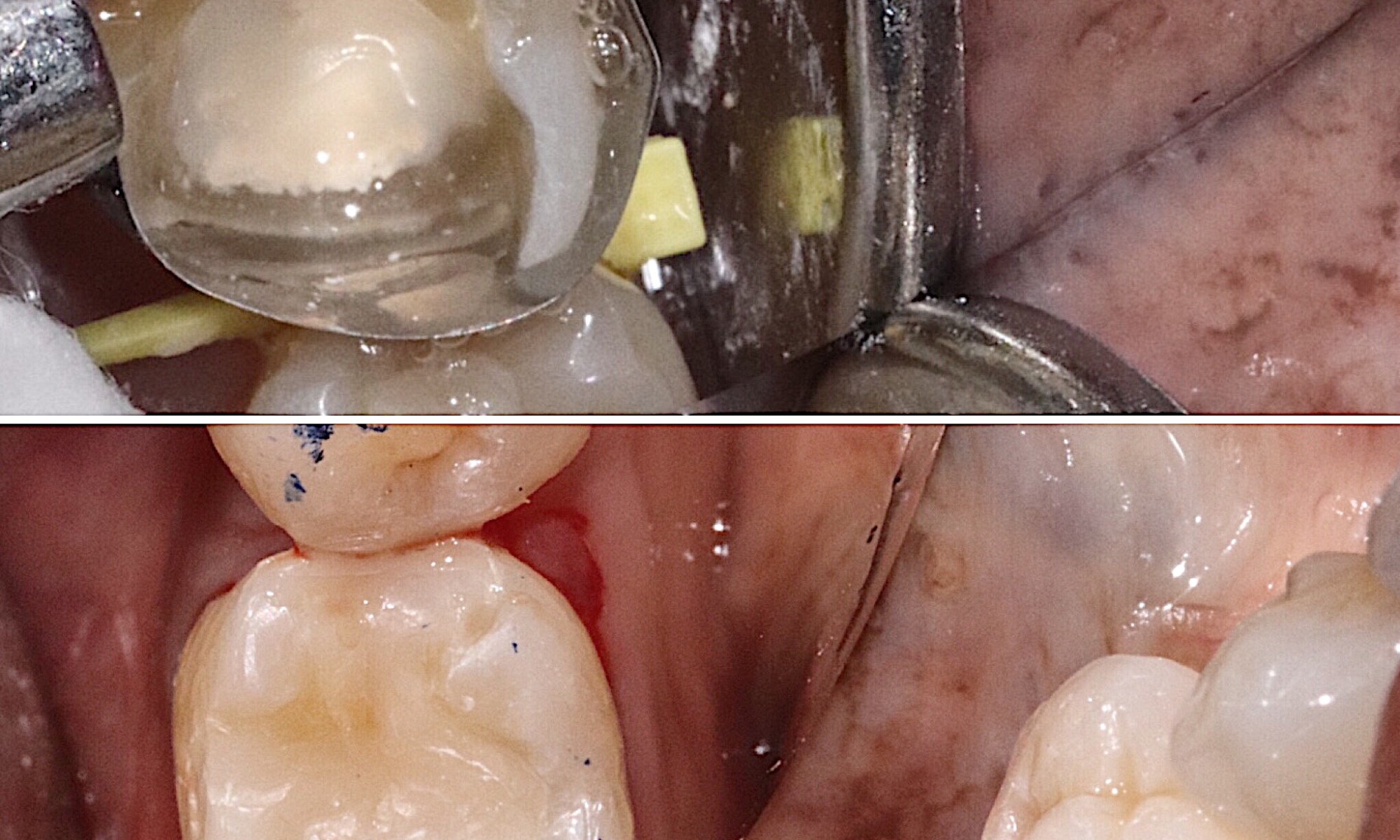 A cavity caused this tooth to chip and break away. We restored this tooth temporarily using a white filling and a crown was completed soon afterwards.