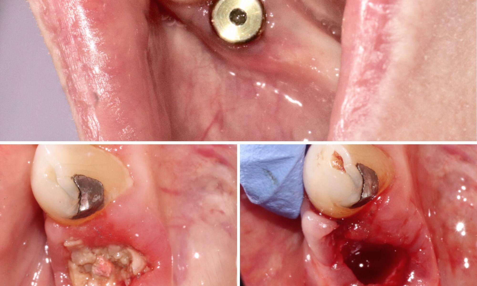 The bottom left picture shows an infection caused from a badly broken down tooth. In a single visit, we removed the tooth and placed an implant using “laughing gas” or nitrous oxide. Patient afterwards told us that this was way easier than expected. 🙂