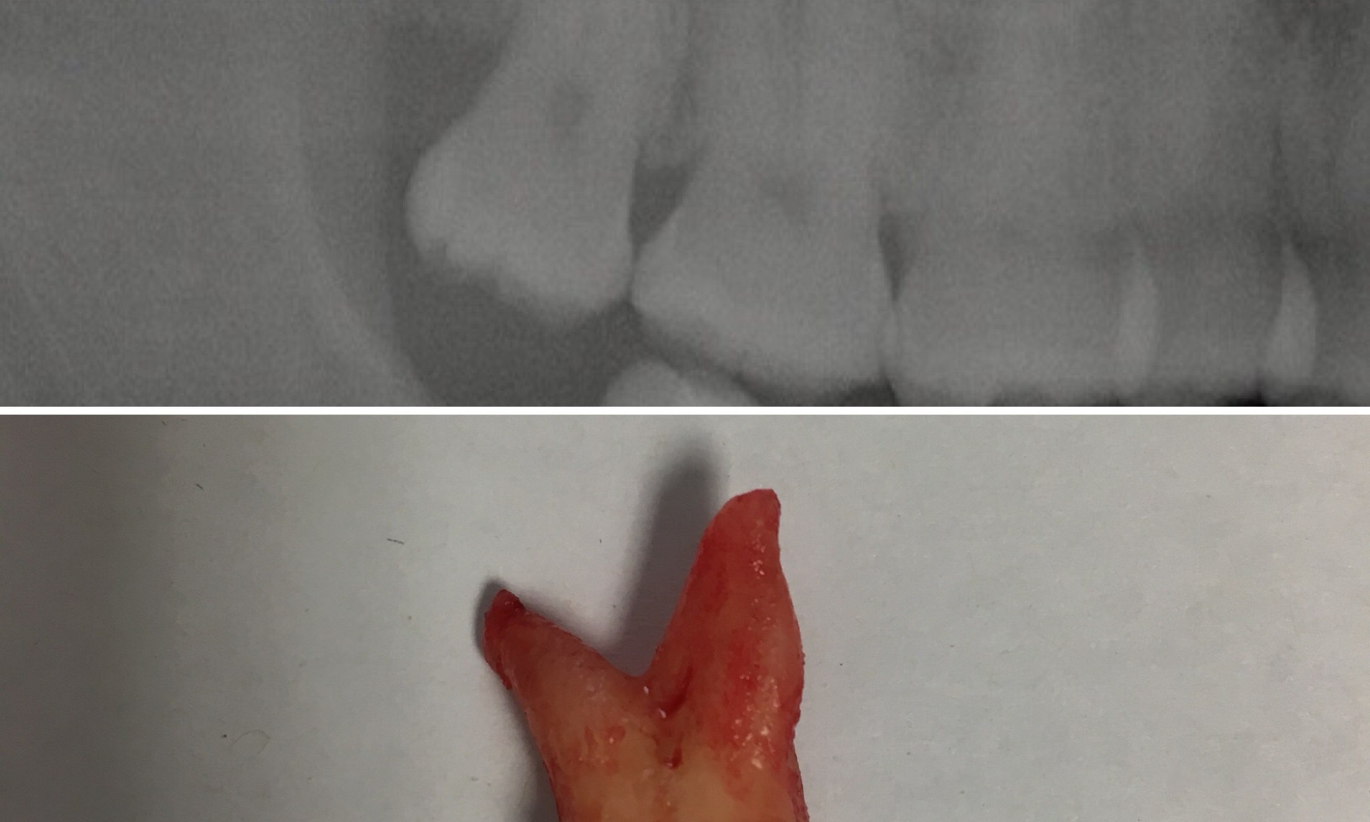 A 2D xray will not always show us the entire picture. After the extraction, we can see the curved palatal root. The tooth was gently “rolled” out.