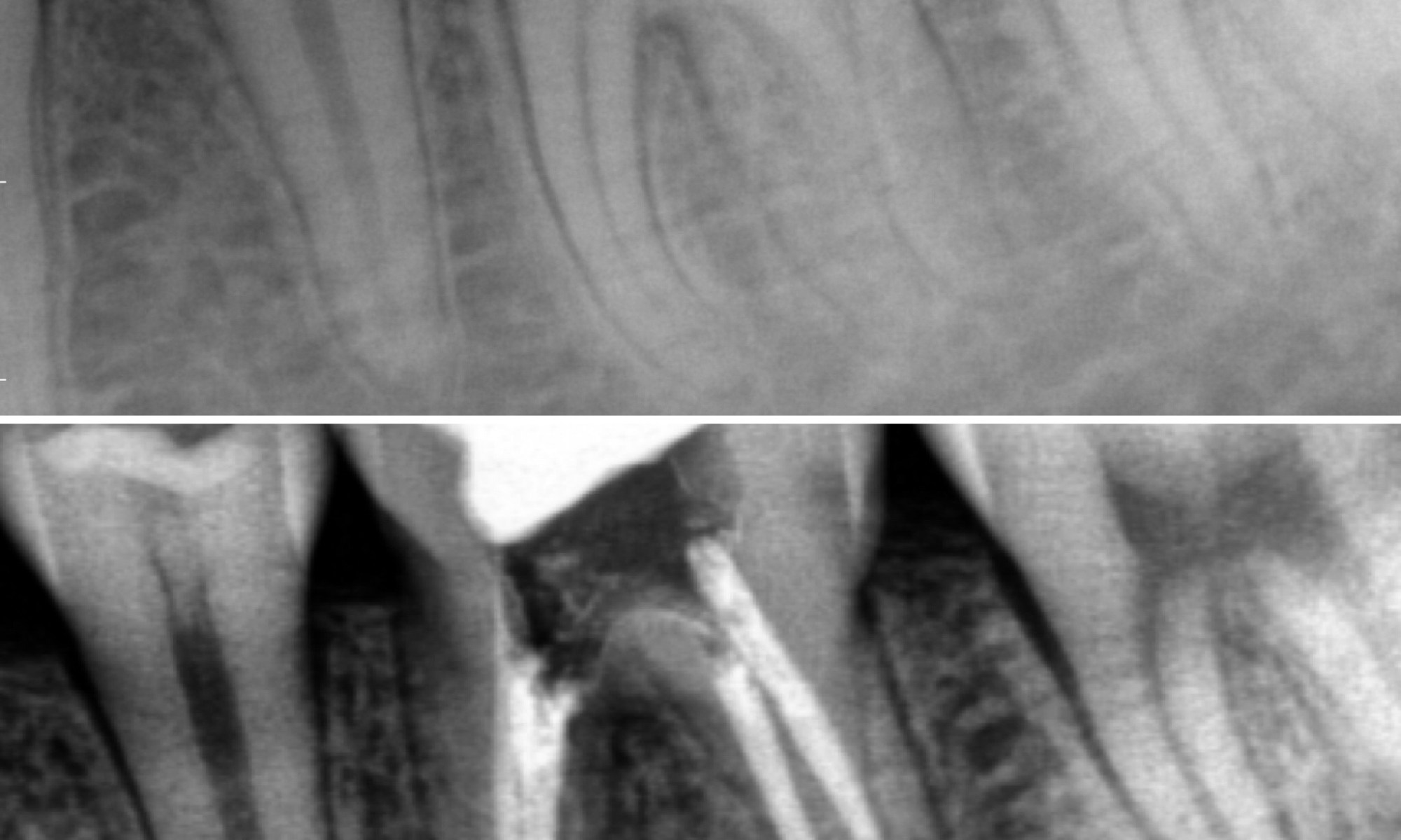 It’s hard to see, but sometimes a tooth can have 5 canals. This tooth was causing a young boy major. Bacteria in the mouth created a hole underneath a filling. A single visit root canal was performed and filled. Pain was relieved.